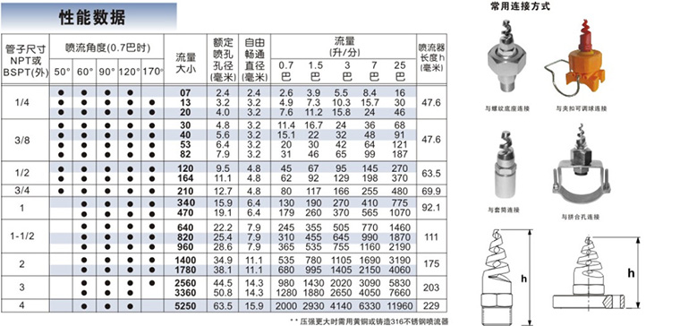 1. 螺旋喷嘴特点:喷嘴进口至出口为畅通的通道设计,几乎消除了阻塞现象,流量大,可提供60°-170°喷雾角度选择。